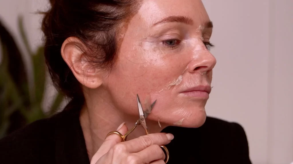 This was the big sheet day. Thick pieces of skin were hanging, especially around the mouth, nasolabial folds, and chin. Hair dye from a recent appointment grabbed onto the peeling skin along my hairline, so it looked extra dramatic. I used sanitized, sharp scissors to clip only the loose, hanging skin (no picking), then patted on a gentle cream for hydration.