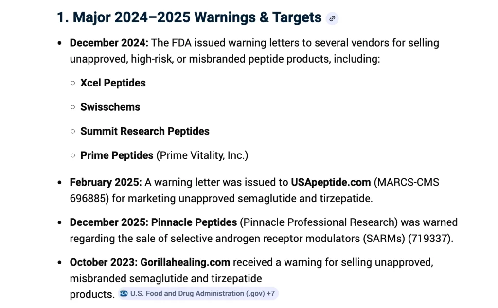 - Increased enforcement on “research use only” peptide sales